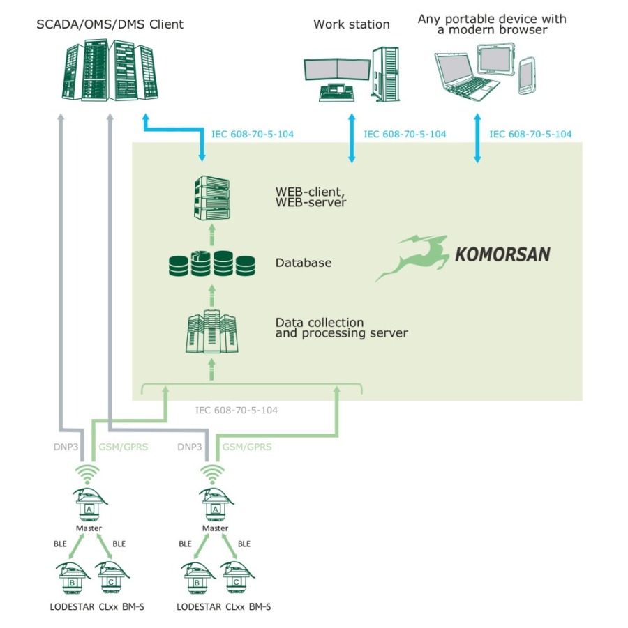 | Integration with SCADA systems | - Connection to any existing SCADA easily via IEC 60870-5-104 by using KOMORSAN software; - Built-in GSM modem (for Lodestar Master FPI); - Data transmission to SCADA system using DNP3 protocol. |